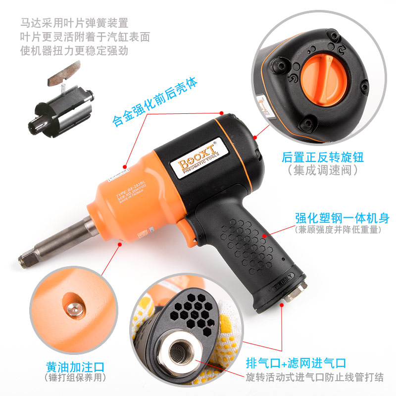 加長軸氣動扳手特點:(塑鋼外殼,強度更高不變形,提高耐用度)
