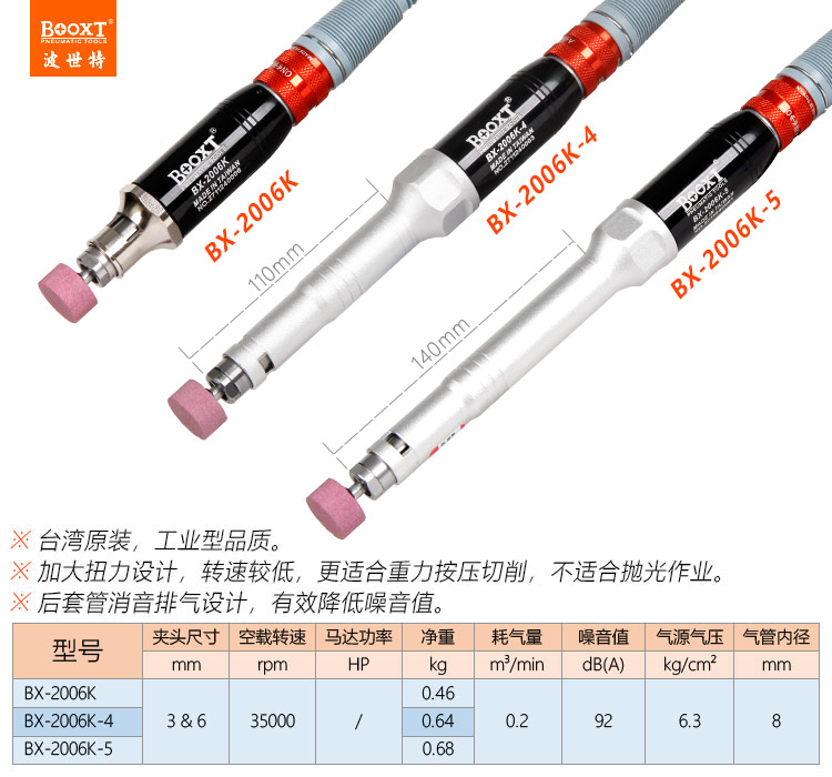東莞市強勁五金工具有限公司提供臺灣BOOXT波世特品牌氣動工具,加長氣動打磨筆BX-2006K-4廠家直銷,首件享特價。咨詢熱線:4008301980